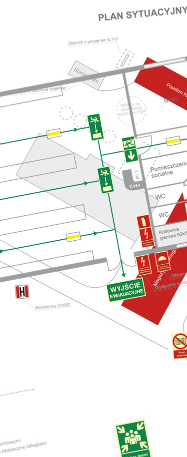 W zależności od potrzeb, opracowujemy graficzne plany obiektów i terenów [plany ewakuacyjne] ludzi z budynków, których głównym elementem są plansze ewakuacyjne.